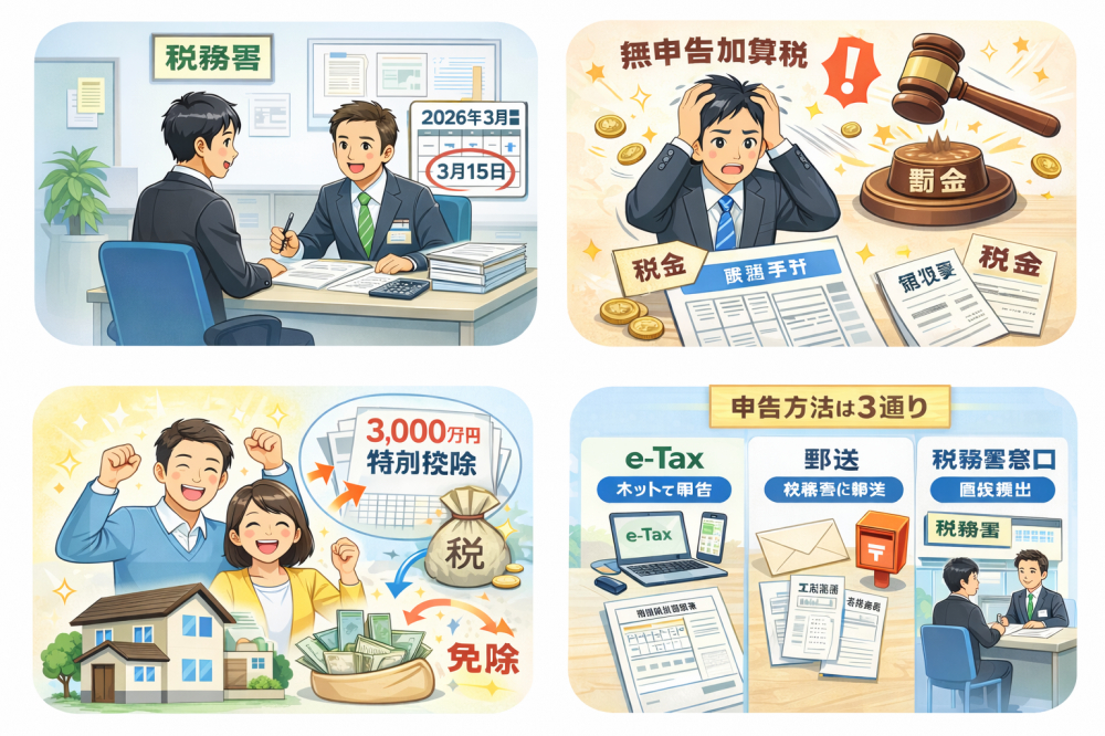 例えば、2025年中に不動産を売却した場合、2026年2月16日から3月15日の間に確定申告を行います。この期間を過ぎると、無申告加算税(15〜20%)や延滞税が課される可能性があります。